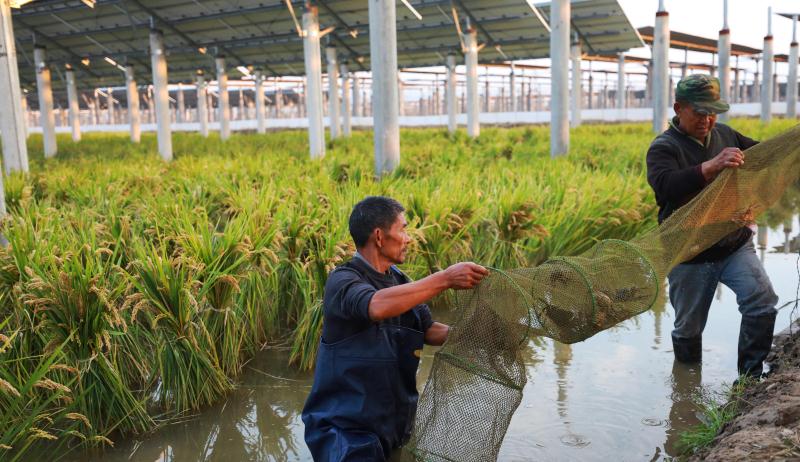 去年,他們在阜寧現(xiàn)代光伏農(nóng)業(yè)產(chǎn)業(yè)示范園試種了水稻,畝產(chǎn)達(dá)到591公斤。今年,他們在20畝水稻田里開始了魚和蟹的混養(yǎng)試驗,現(xiàn)在不僅魚、蟹畝產(chǎn)分別達(dá)到50公斤和25公斤,水稻產(chǎn)量估計在400公斤左右。還有這20畝地上的光伏發(fā)電量,全年可達(dá)92萬度電。既實現(xiàn)了發(fā)電、種植和養(yǎng)殖的一地三用、一光三照,更讓部分村民在家門口回到流轉(zhuǎn)土地上務(wù)工。