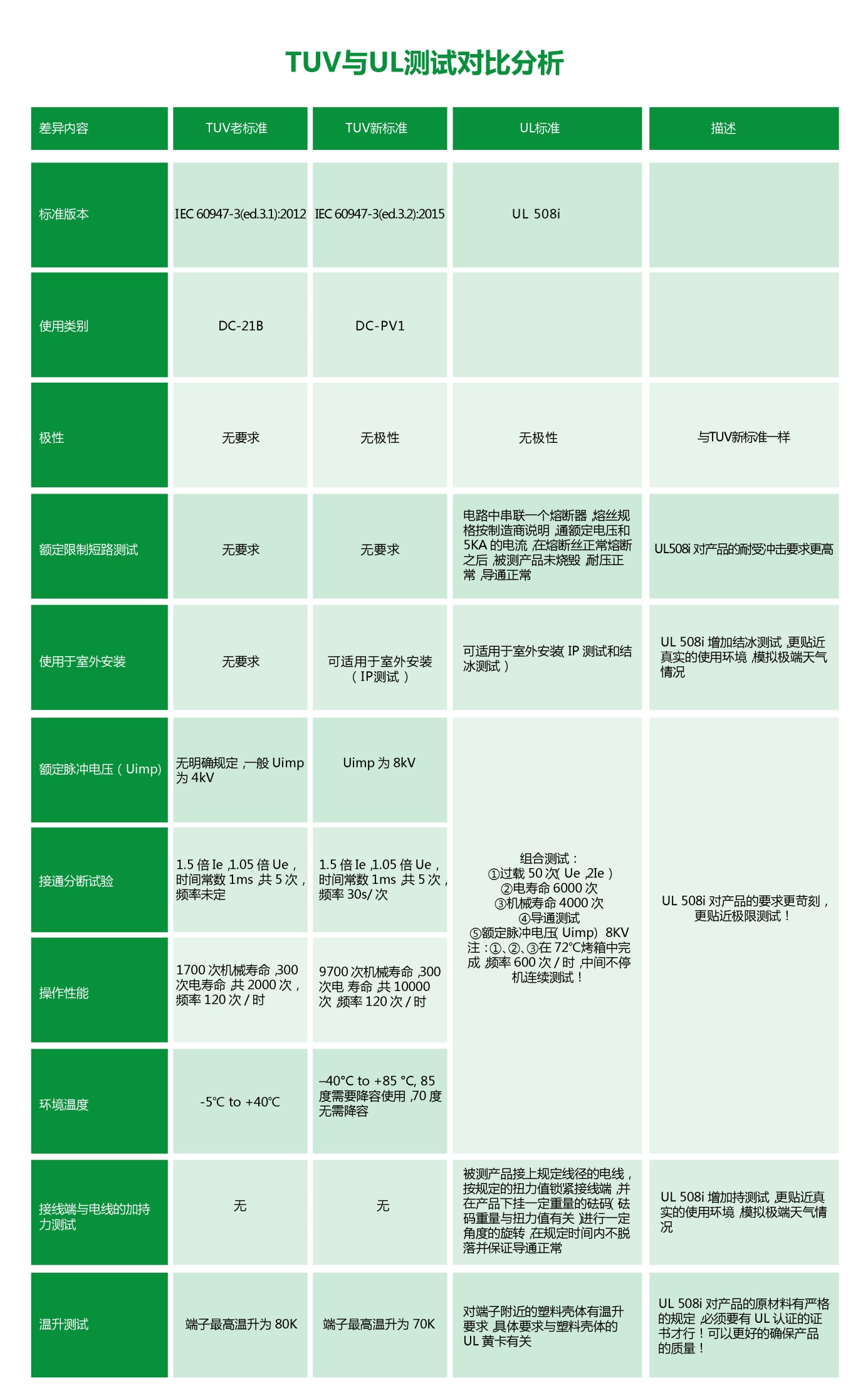 UL508i標(biāo)準(zhǔn)是UL認(rèn)證機(jī)構(gòu)針對(duì)光伏隔離開(kāi)關(guān)產(chǎn)品專門(mén)推出的標(biāo)準(zhǔn),其在對(duì)光伏隔離開(kāi)關(guān)產(chǎn)品的電壽命、極高環(huán)境溫度下的過(guò)載運(yùn)行能力、阻燃性能等關(guān)鍵數(shù)據(jù)指標(biāo)方面均有著非常高的要求。