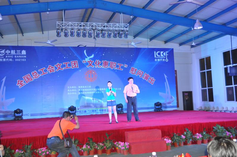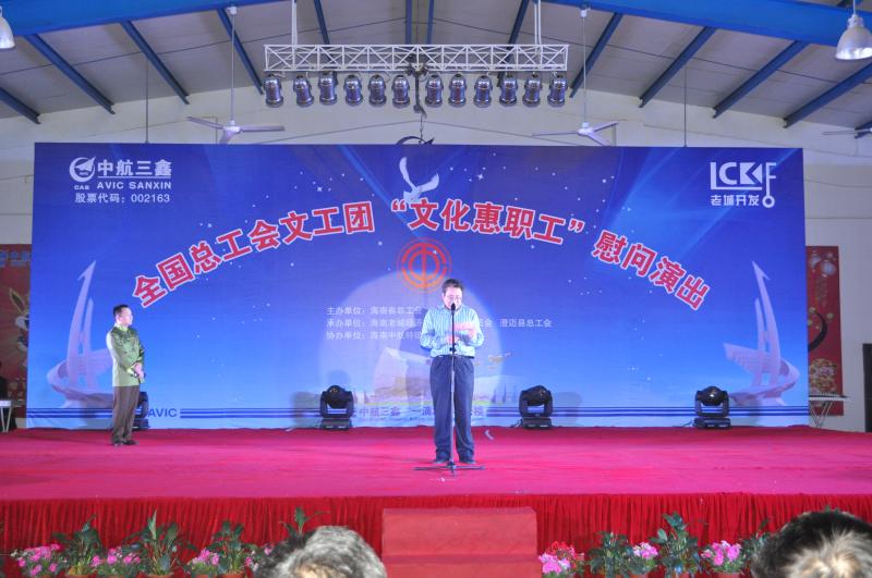海南省老城經(jīng)濟開發(fā)區(qū)管委會副主任梁安忠在演出前的講話中感謝中華全國總工會文工團專程到海南慰問。他說,海南中航特;厥呛D鲜∥、省政府非常重視并大力支持的高新技術(shù)和新型工業(yè)項目。已經(jīng)投產(chǎn)的一線電子汽車玻璃和二線超白TCO太陽能玻璃生產(chǎn)線對加快海南經(jīng)濟發(fā)展、優(yōu)化產(chǎn)業(yè)結(jié)構(gòu)都具有重要意義。他代表省總工會向海南中航特玻公司管理層及所有員工表示真誠的謝意與誠摯的問候。