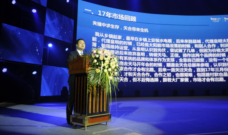 他也教經(jīng)銷商怎么開拓市場(chǎng),提出“市場(chǎng)營銷,渠道為王”。在天合富家的體系中,端到端的供應(yīng)鏈體系,縮短的訂單履約周期,提高的市場(chǎng)響應(yīng)速度,都是基于這些成體系的閉環(huán)管理。徐勁松對(duì)2018年市場(chǎng)的定義是“百舸爭(zhēng)流”,他認(rèn)為堅(jiān)持原裝家用光伏標(biāo)準(zhǔn)是天合占據(jù)行業(yè)競(jìng)爭(zhēng)制高點(diǎn)的核心和關(guān)鍵。2017全年,他都在教經(jīng)銷商怎么對(duì)抗劣質(zhì)企業(yè)的惡意競(jìng)爭(zhēng)。而2018年天合要做的就是在堅(jiān)持推進(jìn)D90保姆式扶商策略的基礎(chǔ)上進(jìn)行渠道升級(jí),升級(jí)客戶體驗(yàn)。