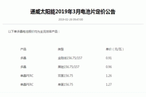 2019年2月26日,通威太陽能在其官網(wǎng)上首次公開電池片價格明細,如下所示:據(jù)悉,相比之前,單晶、多晶PERC電池片的價格從1.3元左右下調(diào)至1.26~1.27元,單晶PERC與多晶PERC的價差僅0.01元/瓦。
