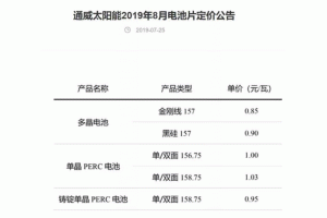 通威太陽能官網(wǎng)發(fā)布8月份電池片定價公告: