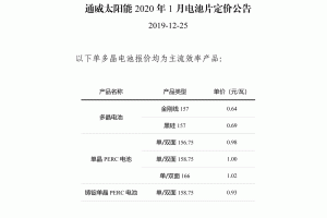 12月25日,通威太陽能發(fā)布2020年1月電池片定價(jià)公告,與2019年12月份價(jià)格相比,單多晶電池片均大幅下調(diào)。詳細(xì)信息如下: