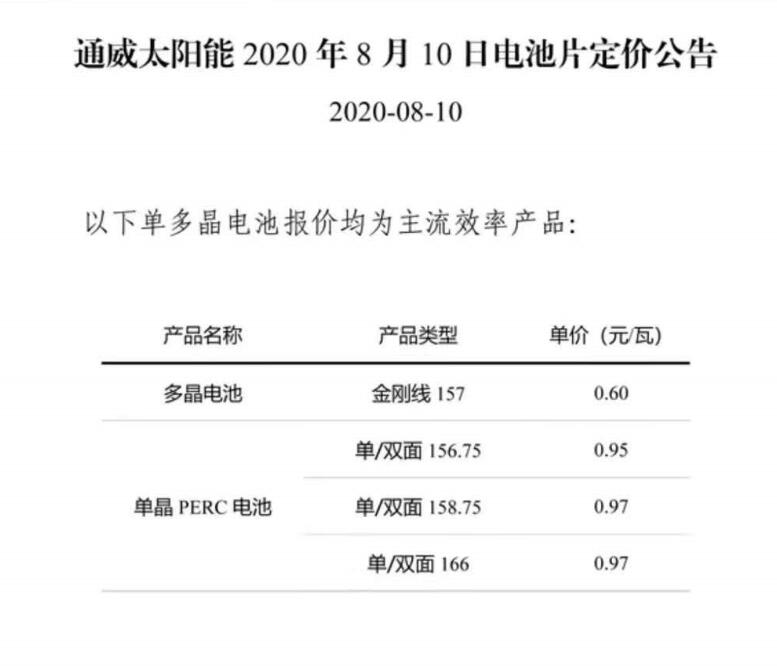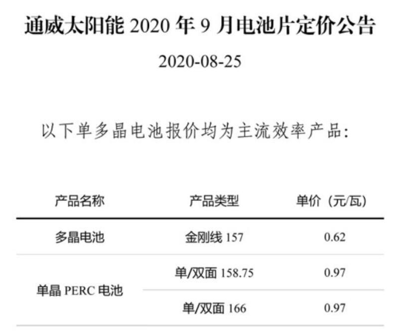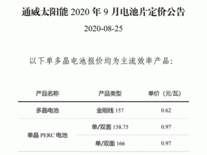 8月25日晚間,通威太陽(yáng)能發(fā)布了9月份的電池片定價(jià)公告:多晶電池金剛線157定價(jià)0.62元/W,上漲2分;158.75單晶單/雙面PERC電池片定價(jià)0.97元/W,166單晶單/雙面PERC電池片定價(jià)0.97元/W。