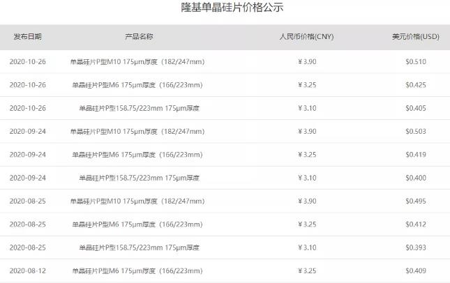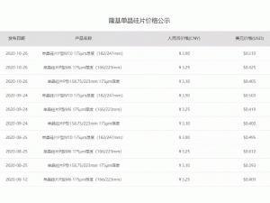 10月26日,隆基官網(wǎng)公布了最新單晶硅片價(jià)格,其中P型單晶硅片M10 175μm厚度(182/247mm)最新報(bào)價(jià)為3.9元/片,單晶硅片P型M6 175μm厚度(166/223mm)最新報(bào)價(jià)為3.25元/片,單晶硅片P型158.75/223mm 175μm厚度硅片最新報(bào)價(jià)為3.1元/片,價(jià)格連續(xù)3個(gè)月保持一致。