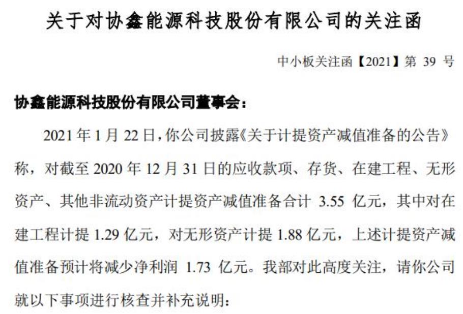 讓人沒有想到還有協(xié)鑫能科的大幅商譽減值。1月22日,深交所向協(xié)鑫能科發(fā)關(guān)注函稱,2021年1月22日,公司披露《關(guān)于計提資產(chǎn)減值準(zhǔn)備的公告》稱,對截至2020年12月31日的應(yīng)收款項、存貨、在建工程、無形資產(chǎn)、其他非流動資產(chǎn)計提資產(chǎn)減值準(zhǔn)備合計3.55億元,其中對在建工程計提1.29億元,對無形資產(chǎn)計提1.88億元,上述計提資產(chǎn)減值準(zhǔn)備預(yù)計將減少凈利潤1.73億元。