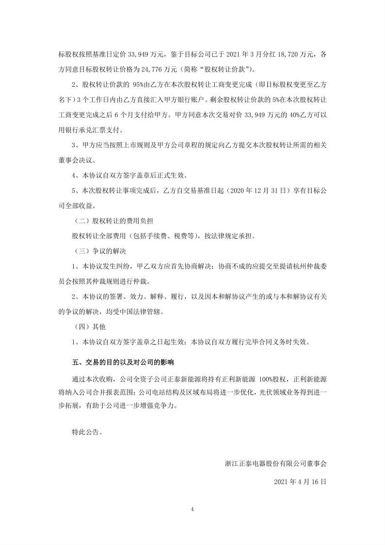 4月15日晚間,正泰電器發(fā)布公告稱,公司全資子公司正泰新能源擬與億利潔能簽訂股權(quán)轉(zhuǎn)讓協(xié)議,收購其持有的正利新能源49%股權(quán),本次交易所涉及的光伏電站裝機容量合計110兆瓦,本次交易金額合計約2.48億元。