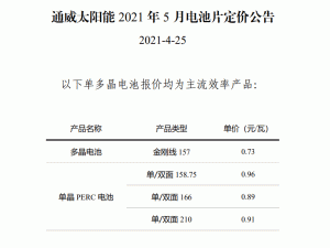 4月25日,通威官網(wǎng)發(fā)布5月電池片定價(jià)公告,多晶電池金剛線157定價(jià)0.73元/W,較上月0.7元/W上漲0.03元/W。