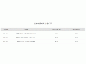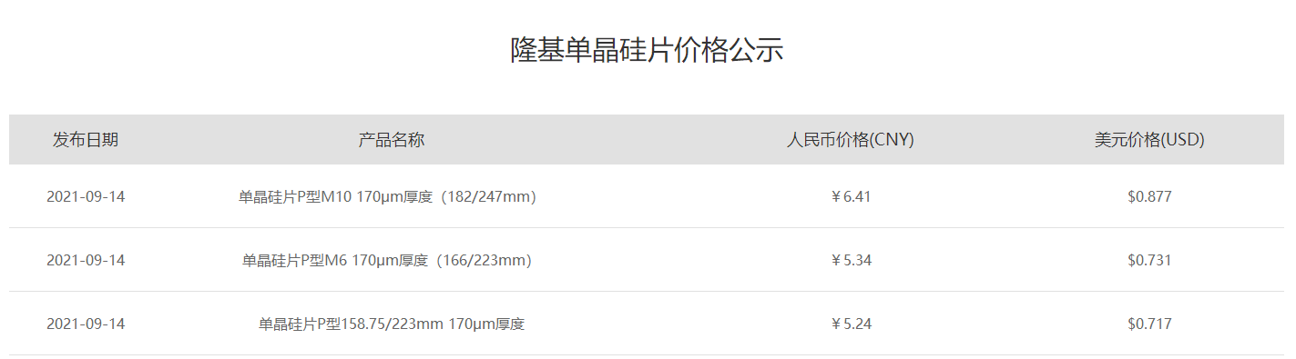 9月14日,隆基官網(wǎng)更新了最新的硅片報價,據(jù)最新的報價顯示,與上月報價相比,隆基158~182尺寸硅片全線上漲0.25~0.30元。