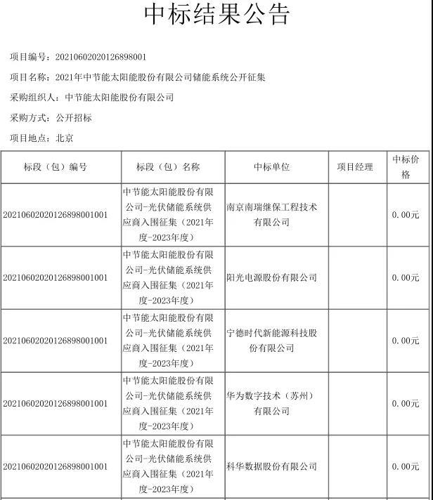 中節(jié)能太陽(yáng)能股份有限公司2021年度-2023年度儲(chǔ)能系統(tǒng)供應(yīng)商中標(biāo)結(jié)果公示,共有10家企業(yè)獲得中標(biāo)!中標(biāo)企業(yè)名單如下:南京南瑞繼保工程技術(shù)有限公司陽(yáng)光電源股份有限公司寧德時(shí)代新能源科技股份有限公司華為數(shù)字技術(shù)(蘇州)有限公司科華數(shù)據(jù)股份有限公司廣州鵬輝能源科技股份有限公司上能電氣股份有限公司天津藍(lán)天太陽(yáng)科技有限公司深圳科士達(dá)科技股份有
