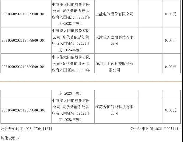 中節(jié)能太陽(yáng)能股份有限公司2021年度-2023年度儲(chǔ)能系統(tǒng)供應(yīng)商中標(biāo)結(jié)果公示,共有10家企業(yè)獲得中標(biāo)!中標(biāo)企業(yè)名單如下:
