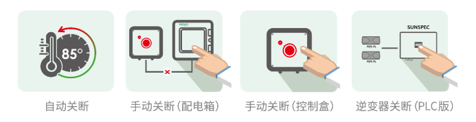 -DC24V款:通過外部交流電源供電,遇到發(fā)生火災或緊急情況時可通過斷開交流電或按下快速關斷上面的緊急停止按鈕,實現(xiàn)對組件的快速關斷。