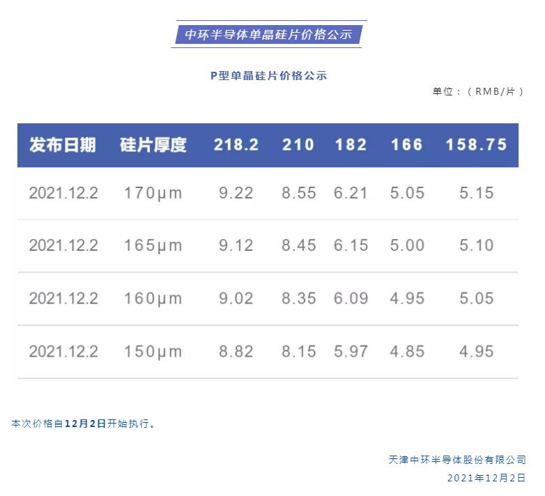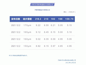 12月2日,中環(huán)股份公布最新硅片價(jià)格,所有硅片報(bào)價(jià)全線下調(diào),其中,G1硅片下降0.52元/片,報(bào)價(jià)5.15元/片,降幅9.1%;M6硅片下降0.72元/片,報(bào)價(jià)5.05元/片,降幅12.48%;G12硅片(170μm)下降0.55元/片,報(bào)價(jià)8.55元/片,降幅6.04%;此外,新增M10硅片報(bào)價(jià),6.21元/片,新增超大硅片218.