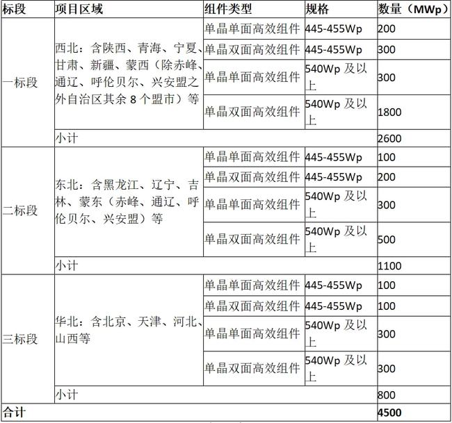 據(jù)業(yè)內(nèi)消息,中國石油工程建設(shè)有限公司12月3日就光伏組件框架協(xié)議舉行公開招標(biāo),本次招標(biāo)項(xiàng)目分為3個(gè)標(biāo)段,分別為西北2.6GW、東北1.1GW、華北0.8GW,項(xiàng)目所在地覆蓋陜西、青海、寧夏、甘肅、新疆、北京、天津、河北、山西等24個(gè)省區(qū)。本次招標(biāo)組件主要以445-455Wp和540Wp及以上為主。其中445-455Wp規(guī)模1GW,占比約22.2%;單雙面比例2:3;540Wp及以上組件3.5GW,占比約77.8%;其中單面規(guī)模0.9GW,雙面規(guī)模2.6GW。