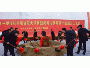 2 月 10 日,正月初十,尚德集團旗下鳳陽尚德太陽能電力有限公司 10 GW(一期)光伏組件項目開工奠基,迎來了虎年開門紅。滁州市委副書記、市長吳勁、滁州市發(fā)改委、市投促局、市經(jīng)信局等領(lǐng)導(dǎo),滁州市鳳陽縣委副書記、縣長王俊卿、鳳陽縣委、政府、人大、政協(xié)等領(lǐng)導(dǎo),無錫尚德執(zhí)行董事汪水云、總裁何雙權(quán)、尚德新能源副總