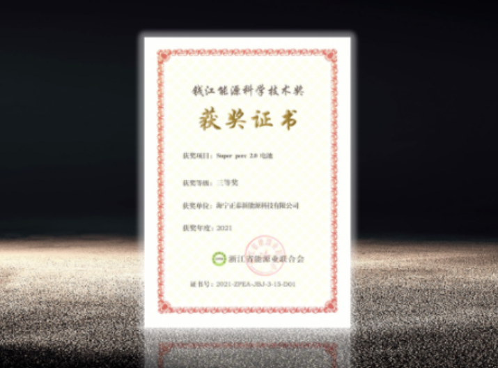 近日,浙江省能源業(yè)聯(lián)合會(huì)授予海寧正泰新能源科技有限公司“Super PERC 2.0 電池”項(xiàng)目2021年度“錢(qián)江能源科學(xué)技術(shù)獎(jiǎng)”三等獎(jiǎng)。
