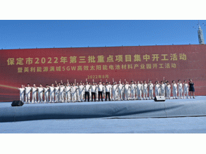 8月16日,英利能源舉行年產(chǎn)5GW高效N型太陽能電池材料產(chǎn)業(yè)園項(xiàng)目開工儀式。保定市委書記黨曉龍,市委副書記、市長閆繼紅等市領(lǐng)導(dǎo);英利能源董事長尹緒龍、總經(jīng)理熊景峰出席開工儀式。