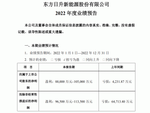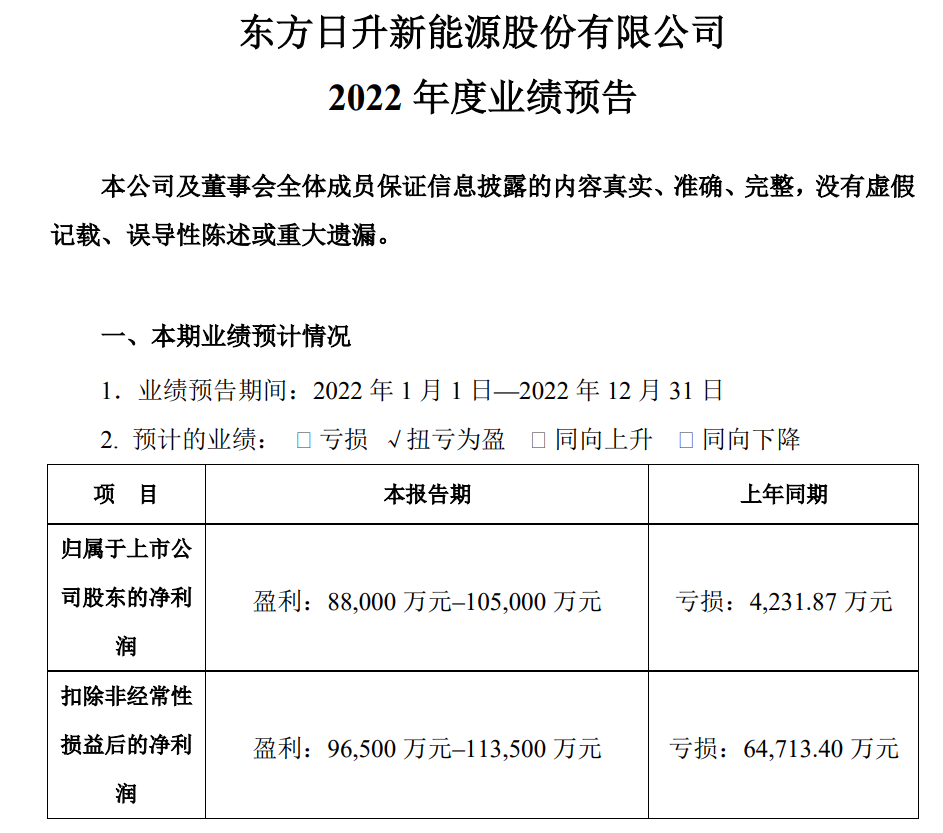 1月30日東方日升發(fā)布2022年度業(yè)績預(yù)告,預(yù)計(jì)2022年歸母凈利潤8.8億元-10.5億元,扭虧為盈。