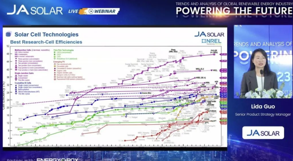 之后,晶澳科技產(chǎn)品戰(zhàn)略高級(jí)經(jīng)理郭邐達(dá)作“光伏技術(shù)創(chuàng)新趨勢(shì)解碼:太陽(yáng)能電池和組件”報(bào)告。她介紹,在未來(lái)兩年內(nèi),p-PERC組件將成為主流產(chǎn)品,而在未來(lái),n型組件可能會(huì)成為單晶PERC之后的主導(dǎo)產(chǎn)品之一。她還介紹了晶澳科技組件核心產(chǎn)品的先進(jìn)技術(shù),包括從2020年的DeepBlue 3.0到2022年的DeepBlue 4.0 X,并補(bǔ)充說(shuō)晶澳將在2023年推出新產(chǎn)品。此外,她強(qiáng)調(diào)了DeepBlue 4.0 X的主要特點(diǎn)和優(yōu)點(diǎn)——可以為住宅和工商業(yè)、和大型地面電站等多個(gè)領(lǐng)域提供更低LCOE的解決方案。