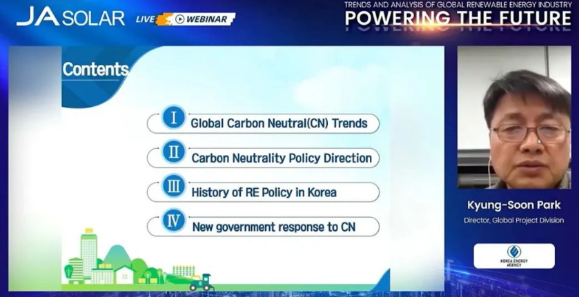 來(lái)自韓國(guó)能源部(Korea Energy Agency,KEA)全球項(xiàng)目部的主任Kyung-Soon Park以“碳中和與可再生能源”為重點(diǎn)作演講。他的演講主要包括全球碳中和趨勢(shì)、碳中和政策方向、韓國(guó)可再生能源政策歷史以及應(yīng)對(duì)碳中和的新政府的響應(yīng)。對(duì)于韓國(guó)而言,Park介紹了可再生能源政策的歷史、國(guó)家計(jì)劃的制定、國(guó)內(nèi)可再生能源分配目標(biāo)的變化以及現(xiàn)狀。他進(jìn)一步透露,自去年3月以來(lái),新政府正在通過(guò)各種政策簡(jiǎn)報(bào)和國(guó)家推廣計(jì)劃,致力于實(shí)現(xiàn)核電與可再生能源的合理和諧。