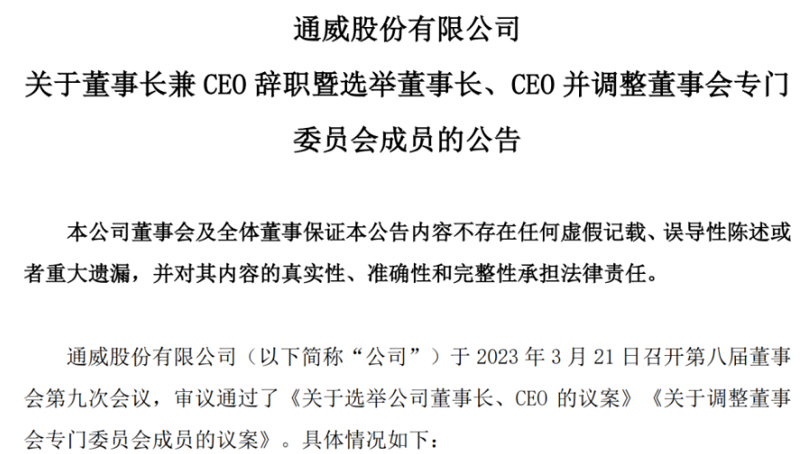 上述公告顯示,通威股份董事會于3月19日收到董事長謝毅提交的書面辭呈。接近通威股份的人士告訴記者,“尊重謝毅先生個人意愿,經(jīng)公司董事會慎重考慮,同意其辭去公司董事長兼CEO及其他職務(wù)!