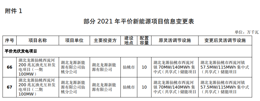 你公司《關(guān)于減容仙桃西流河儲能項目并取消荊州區(qū)菱角湖光伏項目指標(biāo)的請示》(湖北龍源〔2023〕23號)收悉,經(jīng)研究,同意對《湖北省能源局關(guān)于公布2021年平價新能源項目的通知》(鄂能源新能〔2021〕53號)中相關(guān)項目信息進(jìn)行變更,同時將湖北龍源荊州區(qū)菱角湖80兆瓦農(nóng)(漁)光互補光伏發(fā)電項目從2021年度建設(shè)項目清單中取消。有關(guān)項目信息具體變更情況見附件。
