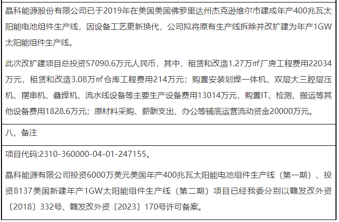11月21日,江西發(fā)改委發(fā)布同意晶科能源投資美國改擴(kuò)建年1GW組件生產(chǎn)線項(xiàng)目備案的通知。