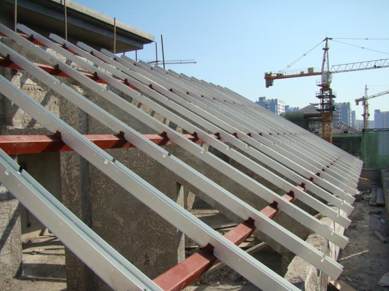 為了加速我國(guó)光伏產(chǎn)業(yè)的健康發(fā)展和國(guó)內(nèi)市場(chǎng)的開(kāi)拓,我國(guó)政府2009年相出臺(tái)了一系列的扶持政策,如財(cái)政部于09年3月26日發(fā)布《關(guān)于加快推進(jìn)太陽(yáng)能光電建筑應(yīng)用的實(shí)施意見(jiàn)》、財(cái)政部、科技部、國(guó)家能源局聯(lián)合印發(fā)了《關(guān)于實(shí)施金太陽(yáng)示范工程的通知》,建筑節(jié)能名列其中并優(yōu)先支持太陽(yáng)能光伏組件應(yīng)與建筑物實(shí)現(xiàn)構(gòu)件化、一體化項(xiàng)目;優(yōu)先支持并網(wǎng)式太陽(yáng)能光電建筑應(yīng)用項(xiàng)目。本高平整度一體化太陽(yáng)能發(fā)電整體屋頂技術(shù),是為了滿(mǎn)足國(guó)家相關(guān)抉持政策的要求而專(zhuān)門(mén)開(kāi)發(fā)的技術(shù),它采用結(jié)構(gòu)設(shè)計(jì)的方法把太陽(yáng)電池組件發(fā)電方陣形成一個(gè)整體屋頂建筑構(gòu)件來(lái)替代傳統(tǒng)建筑物南坡屋頂,實(shí)現(xiàn)了太陽(yáng)能發(fā)電和建筑的完美結(jié)合。該技術(shù)所使用的太陽(yáng)電池組件與現(xiàn)行的太陽(yáng)電池組件不同,它的邊框結(jié)構(gòu)作了較大的改變,變?cè)信c支架的縱向固定為橫向固定,并實(shí)現(xiàn)太陽(yáng)電池組件上下之間的鉸聯(lián)達(dá)到避雨的作用。太陽(yáng)電池組件嵌鑲在特制的固定在建筑屋頂橫梁上的排水槽上。該高平整度一體化太陽(yáng)能發(fā)電整體屋頂,其結(jié)構(gòu)之簡(jiǎn)單、功能之完善、安裝之高效、效果之完美不愧為是一種真正意義上的一體化太陽(yáng)發(fā)電建筑結(jié)構(gòu)件,是一種真正的BIPV建筑技術(shù)。該技術(shù)目前己完成了科技查新報(bào)告、企業(yè)技術(shù)標(biāo)準(zhǔn)、質(zhì)量檢測(cè)報(bào)告、科學(xué)技術(shù)成果鑒定、發(fā)明專(zhuān)利的申請(qǐng)、評(píng)估報(bào)告和規(guī)模化示范工程。