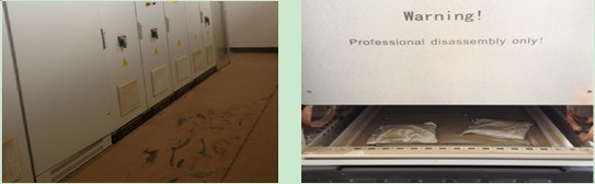 圖1 逆變器機(jī)房的灰塵 圖2 逆變器設(shè)備內(nèi)部的灰塵