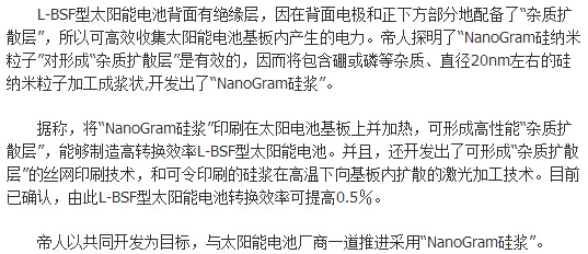帝人公司9月29日宣布,與其美國子公司NanoGram共同開發(fā)出了世界首創(chuàng)的“L-BSF(深結(jié)局部背場(chǎng) ,Local Back Surface Fields)型”高轉(zhuǎn)換效率太陽能電池制造用材料“NanoGram硅漿“及其加工技術(shù)。