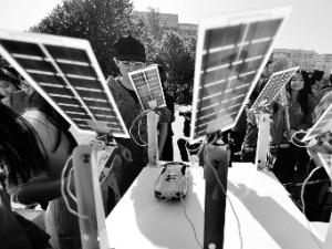 制作者正在講解以太陽(yáng)能發(fā)電為基礎(chǔ)的停車場(chǎng)模型 攝/記者 郭謙 奶油膠制作的手機(jī)殼、廢舊礦泉水瓶制作的電燈罩、純手工制作的皮質(zhì)錢包……上午,北京服裝學(xué)院的校園里聚集了來(lái)自30多所院校的同學(xué)們到此擺攤曬原創(chuàng)。