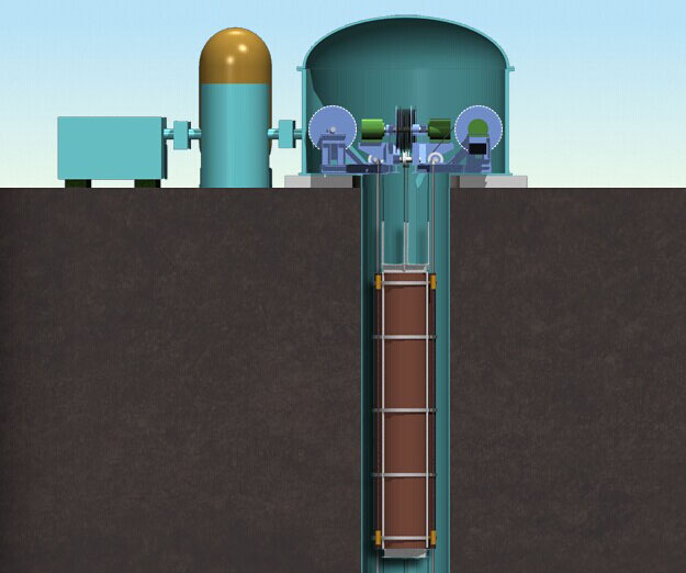 其實(shí),可以將這一系統(tǒng)看成一個(gè)巨大的鐘錘,用密度高又便宜的金屬制成的圓柱形重物用些鋼纜或繩子(現(xiàn)代高強(qiáng)度合成纖維最好不過)吊在洞中,每條繩索連接一個(gè)絞車,儲(chǔ)電時(shí)抬高重物,放電時(shí)降低重物。所有的繩索張力是能夠自動(dòng)平衡同步的,這可以防止重物擺動(dòng)而傷害到軸承等部件。整個(gè)絞盤系統(tǒng)可以通過電驅(qū)動(dòng)器精確控制,保持重物的平穩(wěn)。