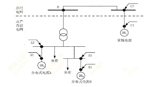 2、接入點(diǎn),是指電源接人電網(wǎng)的連接處,該電網(wǎng)既可能是公共電網(wǎng),也可能是用戶電網(wǎng)。如圖所示,A2、B2點(diǎn)分別為分布式電源A、B的接人點(diǎn)C2為常規(guī)電源C的接人點(diǎn)。
