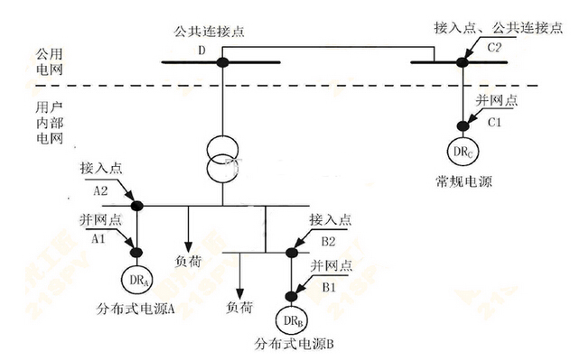 下圖中,A1、A2、B1、B2、C1、C2、D分別屬于下列哪一項(xiàng)? 1)接入點(diǎn),2)并網(wǎng)點(diǎn),3)公共連接點(diǎn) 正確答案是這樣的: 1、并網(wǎng)點(diǎn),對(duì)于有升壓站的分布式電源,并網(wǎng)點(diǎn)為分布式電源升壓站高壓側(cè)母線或節(jié)點(diǎn);對(duì)
