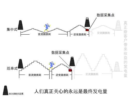 對(duì)于集中式逆變器方案而言,第一個(gè)過(guò)程直流側(cè)要經(jīng)過(guò)直流線纜、直流匯流箱及逆變器三座山,而組串型方案直流側(cè)只經(jīng)過(guò)直流線纜和逆變器兩座山,所以在這個(gè)過(guò)程集中型方案消耗的體力多點(diǎn),也就是說(shuō)我們看到的逆變器上的數(shù)據(jù)組串型剩的多。但是在第二個(gè)過(guò)程,由于集中型方案交流側(cè)的山只有線纜,而組串型還有匯流箱和線纜兩座山,而且由于組串型逆變器位置分散,距離箱變遠(yuǎn),因此爬山體力消耗遠(yuǎn)大于集中式逆變器。所以最后集中式剩余的體力大于組串式。這個(gè)最終剩余的體力才對(duì)我們最有價(jià)值。