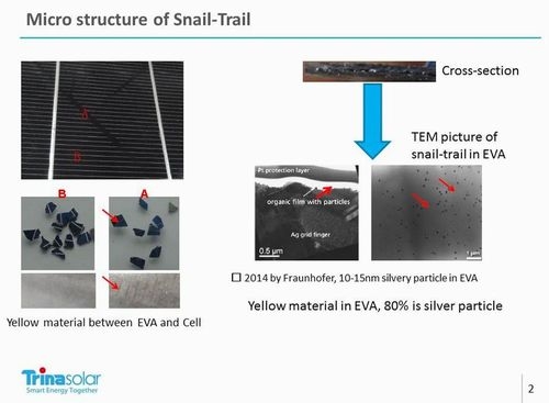 在原來(lái)產(chǎn)生微裂紋之處,因濕氣滲進(jìn)樹(shù)脂背板就可能形成蝸牛紋。雖然初期階段不會(huì)影響發(fā)電量,但將來(lái)可能會(huì)引發(fā)故障。