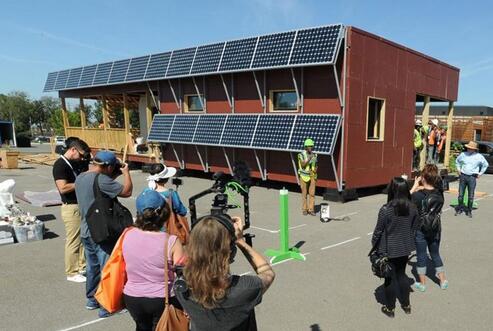 當(dāng)?shù)貢r(shí)間2015年10月7日,美國能源部?jī)赡暌欢鹊奶柲苁?xiàng)全能競(jìng)賽在加州的爾灣市舉行。圖為眾多記者圍繞在紐約城市大學(xué)城市學(xué)院學(xué)生設(shè)計(jì)和建造的緊湊型、可堆疊房屋前拍照。