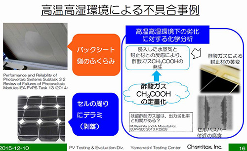 查明了劣化機(jī)制后,就能確定對(duì)策的方向。對(duì)此次的事例,已對(duì)封裝材料使用的EVA,采取了必要措施等,在由太陽(yáng)能電池板廠商和材料廠商努力加以改善。