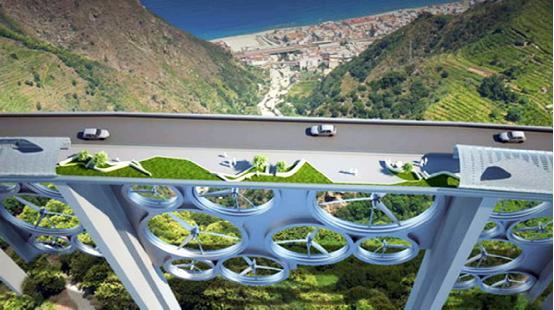 2. 意大利風(fēng)能橋 意大利計(jì)劃在其南部重新修復(fù)一座廢棄的高架橋,加入全新的風(fēng)能發(fā)電系統(tǒng),包括太陽能電池板、風(fēng)力渦輪,每年可以產(chǎn)生高達(dá)4000萬千瓦時(shí)的電力。當(dāng)然,這個(gè)設(shè)計(jì)對(duì)于設(shè)計(jì)師來說充滿了挑戰(zhàn),需要在考慮橋梁穩(wěn)定性的同時(shí),加入發(fā)電系統(tǒng)。