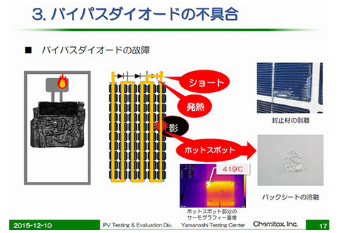 旁路二極管故障造成的故障。造成電池單元過熱和接線盒變形等(出處:Chemitox)