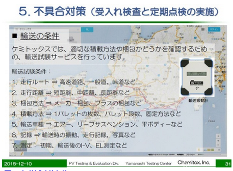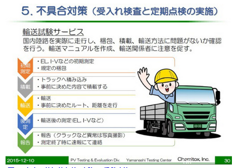Chemitox從這一角度出發(fā),以太陽能電池板廠商和EPC(設(shè)計、采購及施工)服務(wù)運營商為主要對象,開始提供預(yù)防卡車陸路運輸時發(fā)生故障的服務(wù)(圖1)。