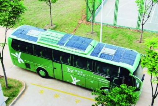 在2015北京國際道路運輸展上,我國首款使用太陽能的大巴車賺足了我們的眼球,太陽能光伏電板就裝在11米長的車頂,電板面積有15平方米。太陽能光伏發(fā)電系統(tǒng)主要由柔性太陽能電池板、光伏動力充電機及相關(guān)連接器組成,電池板具有高效能、高柔性的特點。行駛時,當太陽能電池電力不足時系統(tǒng)會自動切換到充電電池。