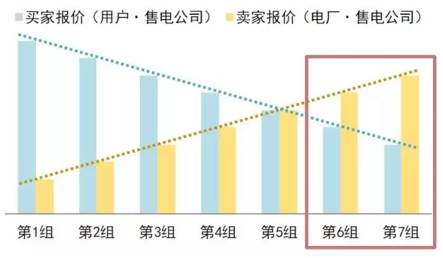 在用戶與電廠報(bào)價(jià)之后,交易中心會(huì)根據(jù)它們的報(bào)價(jià),排列它們交易的先后順序。報(bào)價(jià)越高的用戶和報(bào)價(jià)越低的電廠,越能排到前面,以此類推,一旦電廠的報(bào)價(jià)比和它配對(duì)的用戶報(bào)價(jià)還高,比如說(shuō),電廠報(bào)出的賣價(jià)是3毛錢/度,而用戶報(bào)出的買價(jià)只有2.5毛/度,那么雙方就沒(méi)有成交的可能性了。也就是說(shuō),在下圖中,需求曲線和供給曲線交叉點(diǎn)右邊的報(bào)價(jià),已經(jīng)無(wú)法再進(jìn)行交易了。
