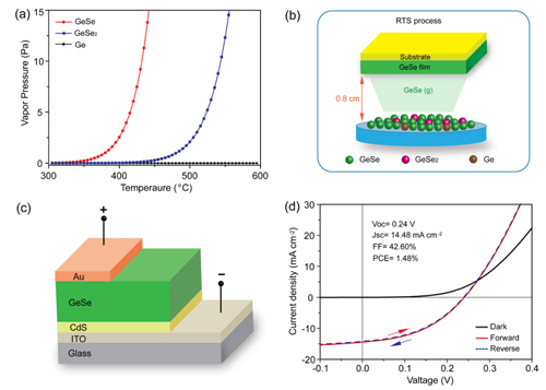 (a)GeSe及雜相Ge、GeSe2的飽和蒸氣壓曲線;(b)快速升華法薄膜制備過程示意圖;(c)GeSe薄膜太陽(yáng)能電池器件示意圖;(d)GeSe薄膜太陽(yáng)能電池J-V測(cè)試曲線。