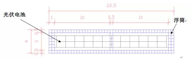 水上光伏基礎(chǔ)根據(jù)水深的不同,主要分為預(yù)制混凝土管樁基礎(chǔ)和漂浮式基礎(chǔ)兩種,漂浮式基礎(chǔ)又主要分為:傳統(tǒng)浮筒+支架基礎(chǔ)和光伏專用一體化浮筒基礎(chǔ)。上期小編介紹了光伏專用一體化浮筒基礎(chǔ)水下混凝土錨塊進(jìn)行初步設(shè)計,本期小編仍以湖北省荊州市某水面為例,對傳統(tǒng)浮筒+支架基礎(chǔ)水下混凝土錨塊進(jìn)行初步設(shè)計。此種形式的光伏方陣仍是由一個個小的單元(一個陣列)組成,因此在實(shí)際計算時,化整為零,選取一個單元作為研究對象,進(jìn)行混凝土錨塊的初步設(shè)計。