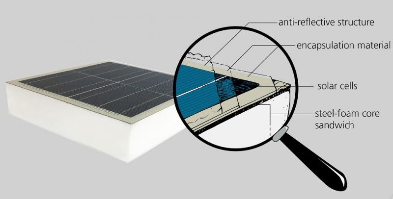 開發(fā)整合于車載的PV模塊必須盡可能輕,同時提供高效率,讓冷卻器的重量保持在最低。此外還需要特別設(shè)計,才能在車頂上安裝PV模塊,同時根據(jù)道路交通規(guī)則保持在最大的高度限制范圍內(nèi)。它們在設(shè)計上必須非常緊密,而且能抵抗動態(tài)機械負(fù)載,例如駕駛振動等。