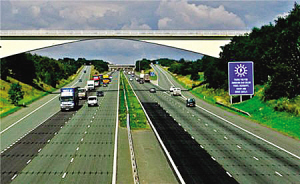 修建“太陽(yáng)能公路”無(wú)需重建公路,只需把一塊塊非常薄的太陽(yáng)能板像地磚一樣鋪在道路表面,并在上層加蓋由樹(shù)脂材料制成的高強(qiáng)度透明板即可。它可以將太陽(yáng)能轉(zhuǎn)化為電能,再通過(guò)地面以下的輸電裝置將電能輸送到城市電網(wǎng)。