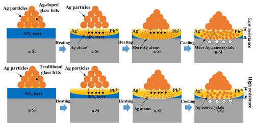 傳統(tǒng)玻璃粉與新型摻銀玻璃粉在晶體硅電池?zé)Y(jié)過程中的示意圖