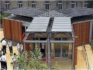 6月16日,由同濟大學(xué)學(xué)生設(shè)計建造的“陽光集裝房”正式亮相上海。這座造價25萬美元的“陽光集裝房”建筑面積90平方米,由6個集裝箱每2個一組拼裝成Y字型空間,室內(nèi)家具電器一應(yīng)俱全,全部由太陽能供給。太陽屋還集成了多項建筑節(jié)能技術(shù):對安裝在屋頂?shù)墓夥l(fā)電系統(tǒng),結(jié)合實際情況進行優(yōu)化;天花板、墻壁、地面都裝有高性能的新型真空保溫板;將太陽能熱水集熱與空調(diào)廢熱回收,集成為一體,提高了太陽能的總體利用效率;利用導(dǎo)光管將自然光引入用于室內(nèi)照明,屋頂還配置有雨水收集和中水回用系統(tǒng),最大限度地利用自然資源。此外,居室內(nèi)環(huán)境監(jiān)測、能源管理、設(shè)備管理等全部實現(xiàn)了數(shù)字化、信息化、可視化,住宅的產(chǎn)能、能耗、居住環(huán)境等數(shù)據(jù)信息能實時直觀展示,還可利用3G手機等移動終端進行遠程監(jiān)管。