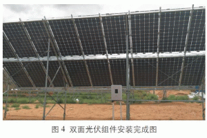 5)特殊的支架形式需求。常規(guī)支架形式會(huì)遮擋雙面光伏組件背面,不僅減少背面光線,而且會(huì)造成組件內(nèi)電池片間串聯(lián)失配,影響發(fā)電效果。雙面光伏組件的支架應(yīng)設(shè)計(jì)成“鏡框”形式,避免遮擋組件背面。圖4為雙面光伏組件安裝完成圖。